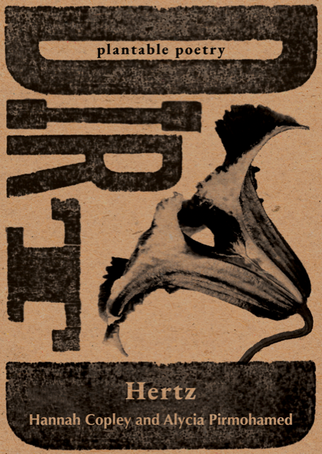 A collaboration between Alycia Pirmohamed and Hannah Copley. The poem(s) in Hertz burst out of the restrictions of formal poetic categories. Themes of decaying whilst still alive, and what hurts the living, surface through the poets’ intimate attentions to soil.